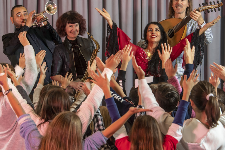 Vier Künstler/innen der Gruppe SSASSA aus dem Irak, aus Nordmazedonien und aus der Schweiz bieten das interkulturelle Musikprogramm «Schnabelwetzer – 7 Lieder in 7 Sprachen» zum Mitmachen an. Singend, klatschend und tanzend lernen die Kinder mitreissende Songs ihrer Mitschüler/innen aus Serbien, Albanien, Spanien, der Türkei, Portugal sowie ein arabisches Lied und einen Mundartsong kennen. Mit 20 Instrumenten wie Trompete, Bouzoukie, Oud, Flamencogitarre und Darabuka entführt SSASSA auf eine unvergessliche musikalisch- interkulturelle Erlebnisreise.