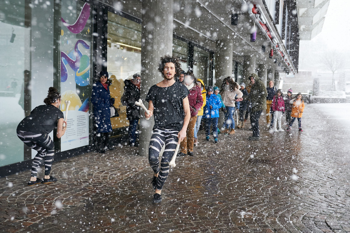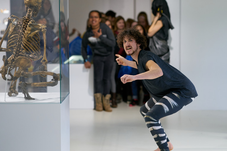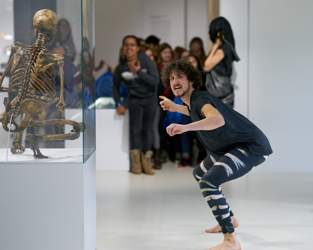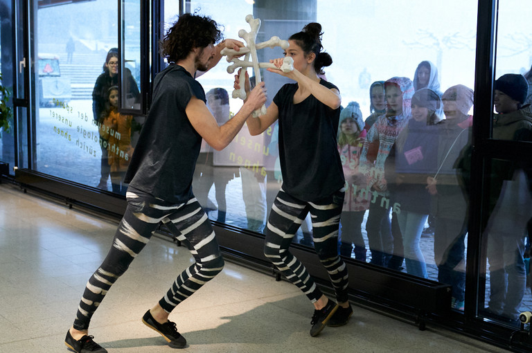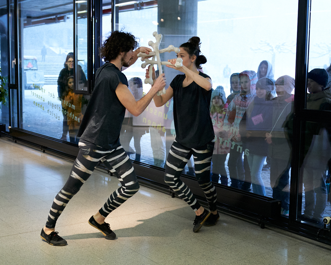 Die Tanzerlebnistour #knochen ist Tanzvorstellung und Workshop in einem. Zusammen mit euch ergründen wir die Evolutionsgeschichte des Planeten Erde, seiner Spezies und die Geschichte der Menschheit. Unsere Knochen haben wir immer mit dabei. Mit «Hash» und «Tag», zusammen #, zwei Figuren, die sich in jeder Zeit helfen, streiten, gernhaben, eigene und gemeinsame Wege gehen, reist ihr durch die Zeiten und durchs Museum. Auf der Suche nach uns selbst und dem Sinn des Lebens, testen wir unsere Überlebensstrategien und einander aus und in jeder Episode unserer Zeitreise hinterlassen wir Abfall, äh #’s. Wir zählen auf euch um alles, was liegen bleibt einzusammeln und wir helfen euch dabei, das Gesammelte in einen Zeitstrahl einzuordnen. Dazwischen gibts Tanz und einige Abenteuer zu erleben!