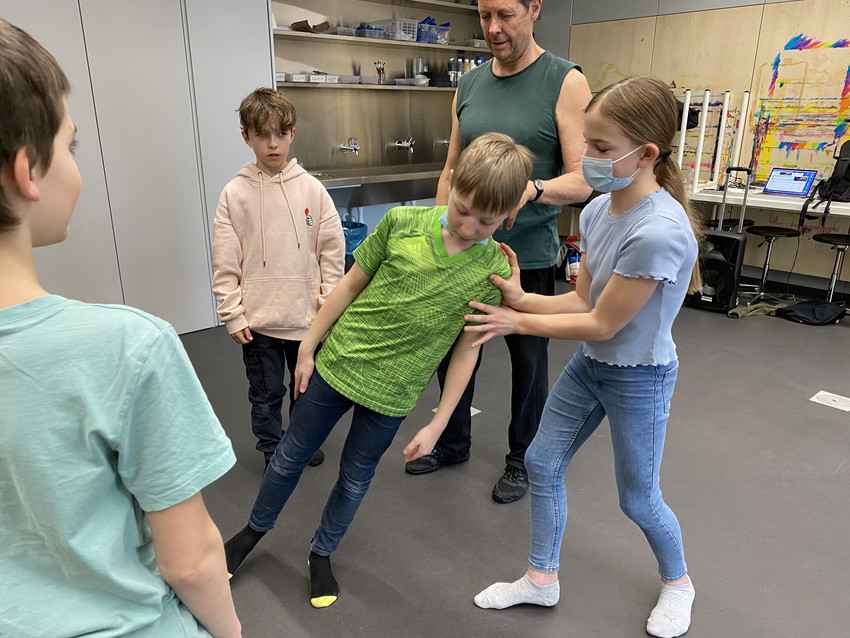 Loch/Mozzini: Den Schülerinnen und Schülern gefällt die Vorstellung, dass sich die Skulptur nur nachts traut, aus ihrer Starre zu erwachen. Das finden sie super spannend und geheimnisvoll – auch, weil sie während ihrem eigenen Tanz immer wieder kurz erstarren müssen, da vielleicht gerade ein Security die Runde macht.