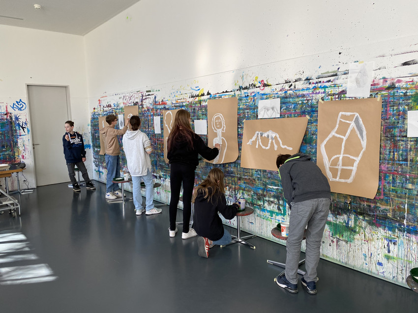 Straumann: Ganz allgemein die Freude, mit der die Schüler/innen ihre Skizzen von Giacomettis Skulpturen mit grosszügigen Pinselstrichen an den Malwänden umsetzen und den Tanz vorführen.