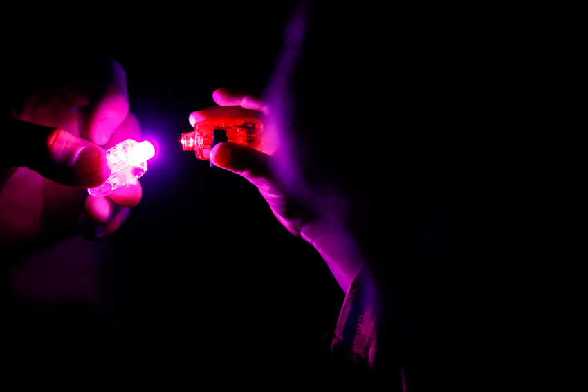 Bevor wir die Taschenlampen in der Klasse verteilen, machen wir eine kurze Performance mit Live-Musik, stellen ihnen unsere künstlerische Welt vor und zeigen, wie wir forschen. Diese Form von Performance verlangt von uns, dass wir nichts vorspielen und behaupten, sondern echt sind und somit glaubwürdige kreative Vorbilder.