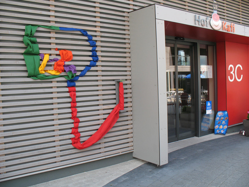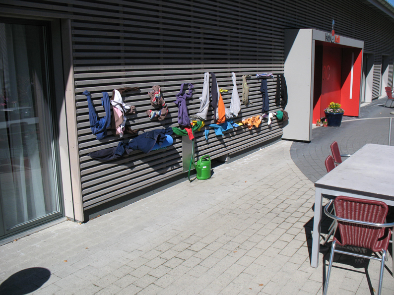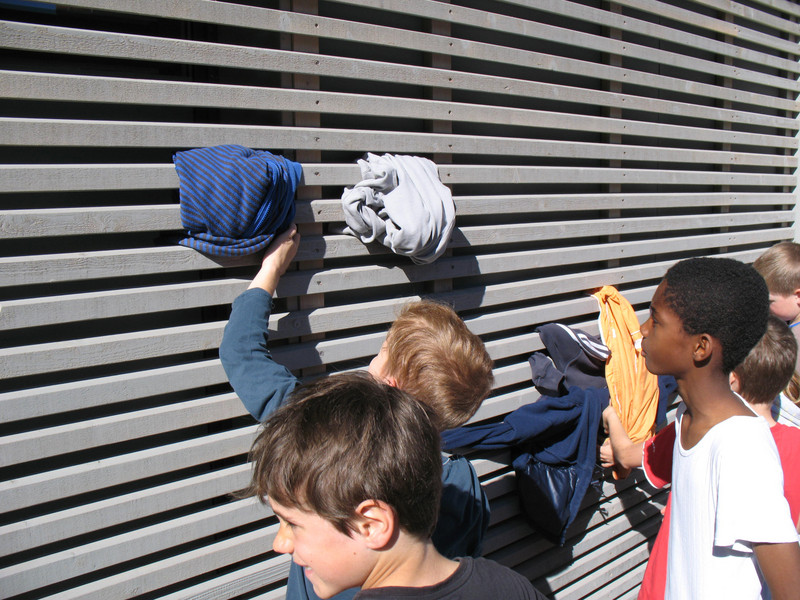 In den Beobachtungen hat sich die Fassade aus Holzlatten als zentrales Element hervorgetan. Was die Kinder mit ihren Kleidern an der Fassade des Meilihofs experimentell ausgetestet haben, kann nun mit einem 12 m langen Stoffband (in den Lieblingsfarben der Klasse) von jedermann versucht werden: immer wieder neue Muster, Strukturen und Bilder zwischen die Latten der Holzfassade stopfen.