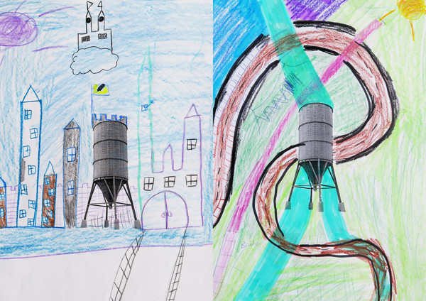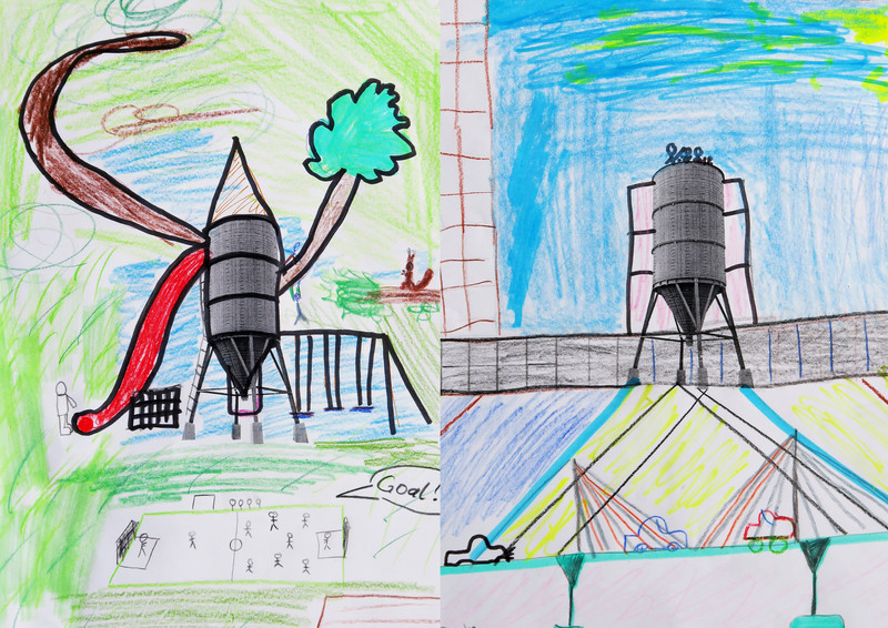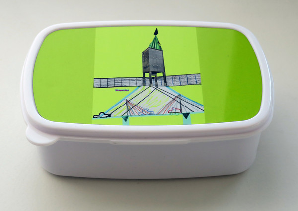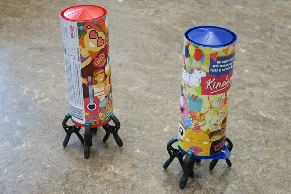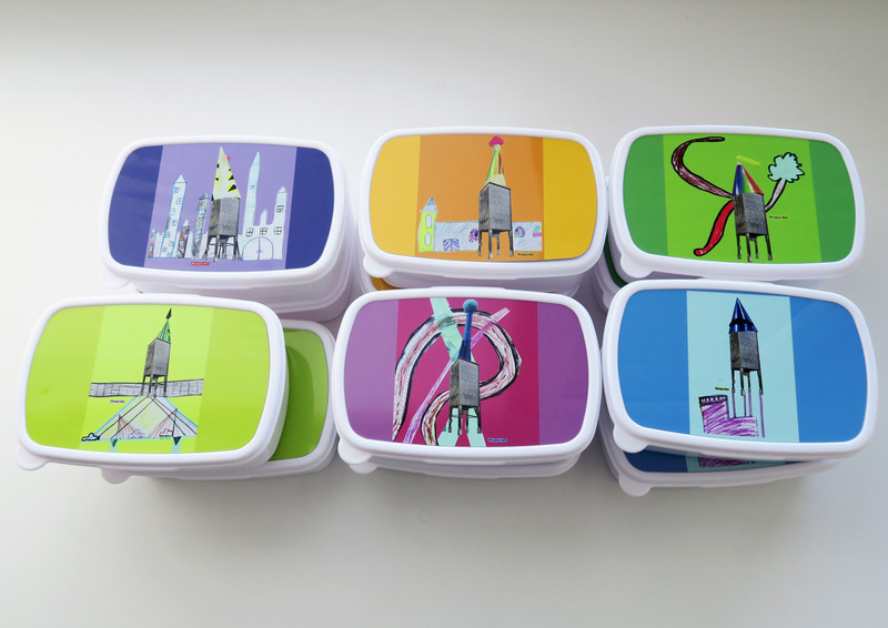 Zwei Tischbomben werden am Anfang der gemeinsamen Atelierarbeit gezündet: Pappnasen, Konfetti, Trillerpfeifen, Luftballone, Pokerkarten, Luftschlangen und weiterer Krimskrams fallen auf den Boden des Klassenzimmers. Alles wird von den Kindern eingesammelt, um als Bausteine für bunte Mondraketen und andere Raumfahrzeuge eingesetzt zu werden. Die Raketenteile werden anschliessend mit einem Foto des Hedinger Streugutsilos verwoben, collageartig in skizzenhafte Stadtlandschaften integriert und zuletzt auf praktische Lunchboxen gedruckt. Für die Vespa-Jet-Klasse ist klar: In Tischbomben stecken ganz viele nützliche Dinge für den täglichen Gebrauch drin!
