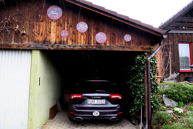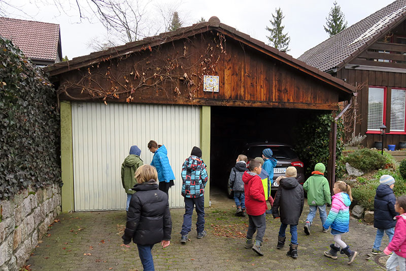 «Ja natürlich, ihr könnt sehr gerne für meine Garage ein Kunstwerk entwerfen. Der beste Ort dafür ist der Giebel. Aber nur die rechte Hälfte, weil die linke Seite der Garage gehört nicht mir.» Herr Stucki gibt also den Kindern der 1. – 3. Klasse von Anja Tischer und Björn Engeloch ziemlich genaue Vorgaben mit auf den Weg, als sie ihn zum Mitmachen beim 19. Projekt von Vespa-Jet anfragen. In der rechten Hälfte des Garage-Häuschens hat es kein Tor und deshalb ist sofort erkennbar, dass Herr Stucki einen Ford fährt. Prominent präsentiert er sein Hinterteil den Passanten auf der Quartierstrasse – der Ford natürlich, nicht Herr Stucki.
