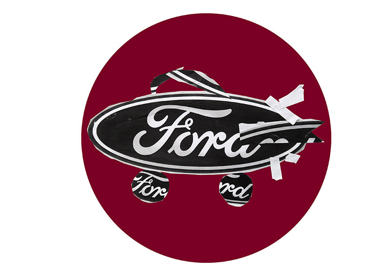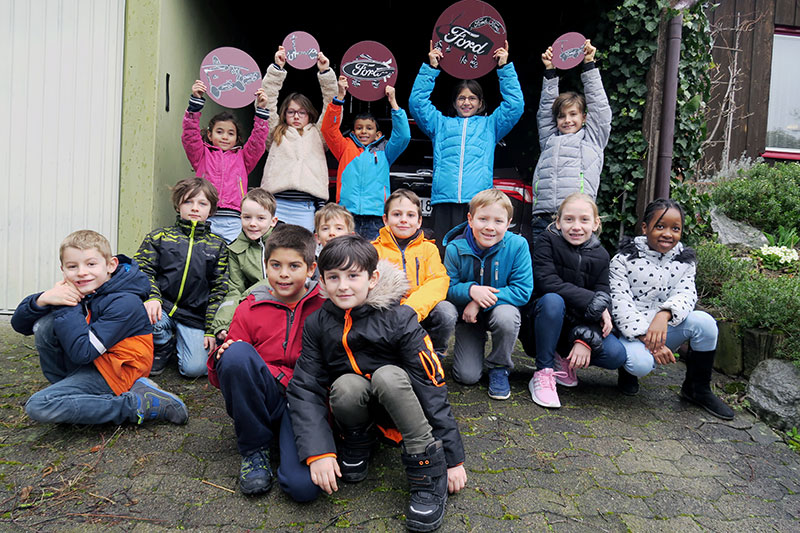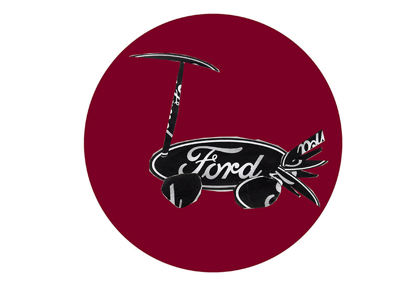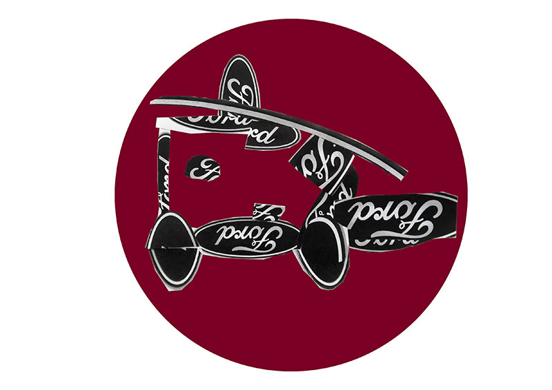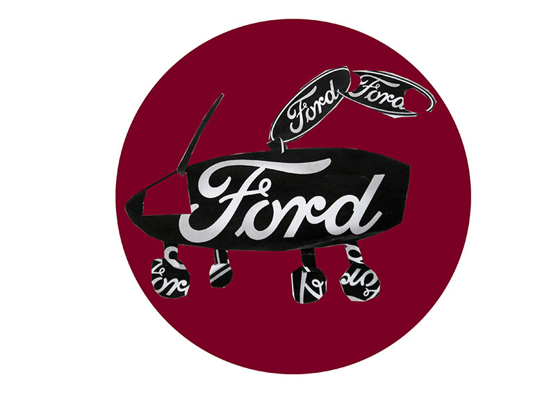 GARAGE – GIEBEL – FORD. Diese drei Begriffe stehen am Anfang der Zusammenarbeit mit den jungen Entwerfern aus Obfelden. Das Ford-Logo ist dabei der zentrale Baustein für die Entwurfsarbeiten. Mit den vier Buchstaben der Automarke erfindet die Klasse neue Fahrzeuge. Roller, Personenwagen, Fahrräder, Lastwagen, Raupenfahrzeuge und vieles mehr. Entwickelt werden die Collagen mit einem Rotations-System: Jedes Kind arbeitet eine Zeit lang an einem Blatt, gibt dieses dann weiter und erhält selber ein neues – rund zehn- bis zwölfmal wird rotiert. Von den fertigen Gemeinschaftsfahrzeugen werden 5 ausgesucht, auf Aluminiumrondellen gedruckt und dem Nachbarn als Geschenk an den Giebel der Garage montiert.