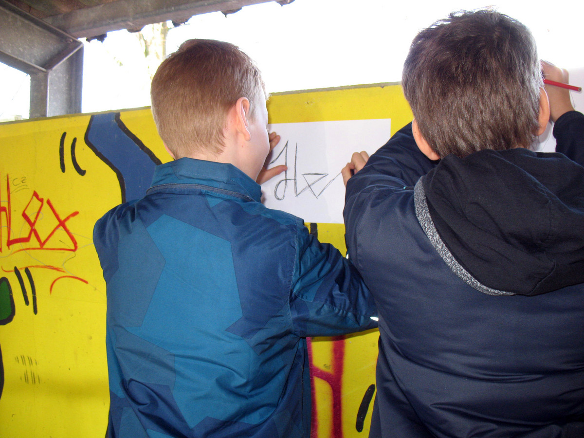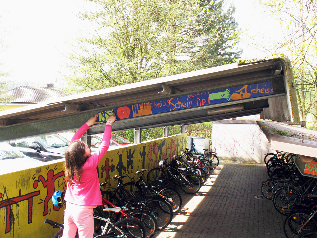 Diese zwei Themen verlinkt die Klasse miteinander. Zuerst werden die Kritzeleien genauer untersucht und abgezeichnet. Nun wird alles in neue, farbige Zeichen übersetzt (in den leuchtenden Primärfarben der Haring-Figuren), danach auf kleine magnetische Farbplättchen gedruckt und schlussendlich als Fries in die Stahlträger unter dem Dach integriert.