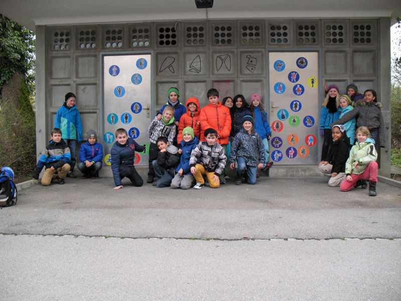 Nur ein paar Schritte ausserhalb ihres Schulareals sind die 3. Klässler von Martina Uehli auf ein architektonisches Kleinod aus den 1950er Jahren gestossen, das sofort ihr Interesse und ihre Neugierde geweckt hat: das inzwischen stillgelegte, aber unter Denkmalschutz stehende WC-Häuschen am Reitweg.