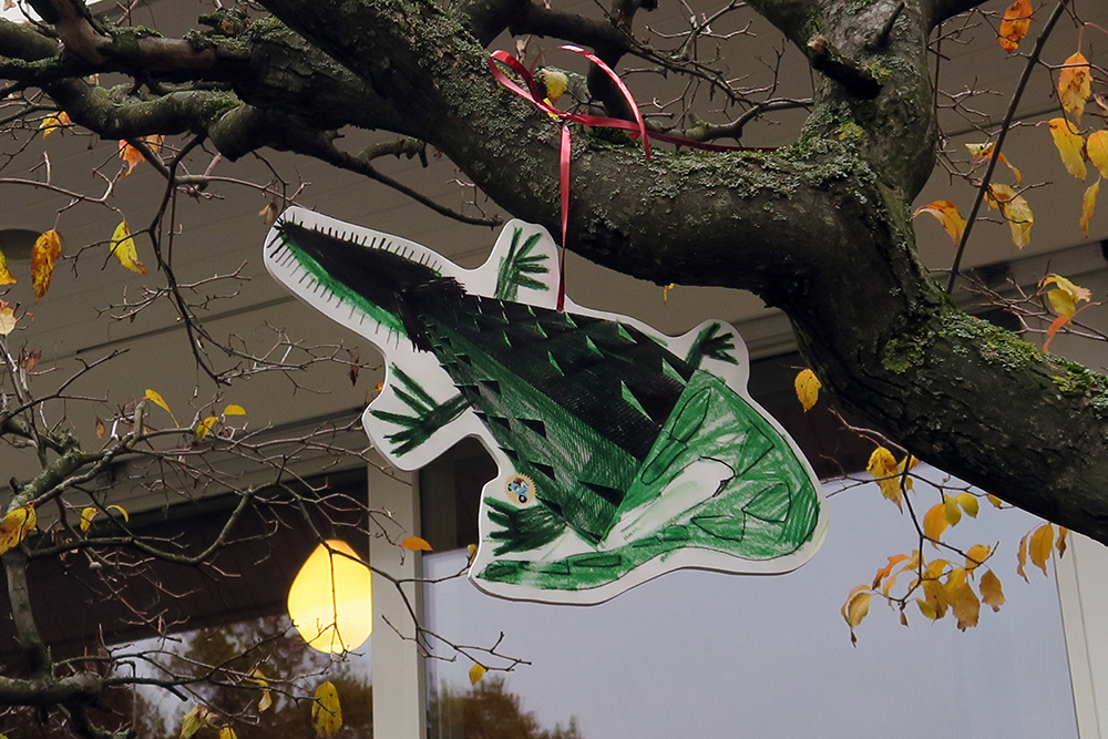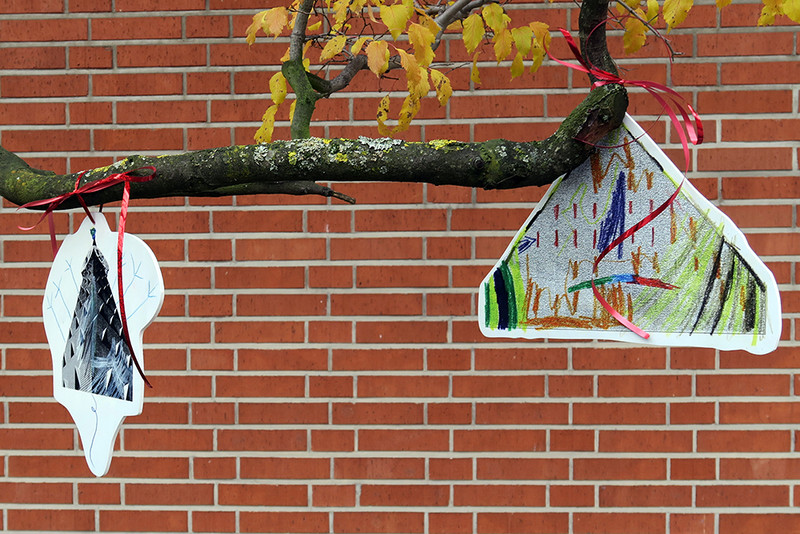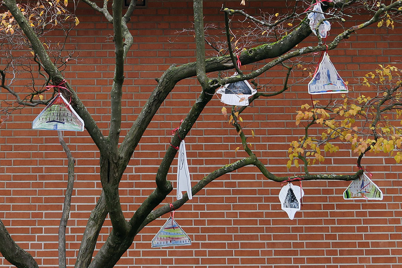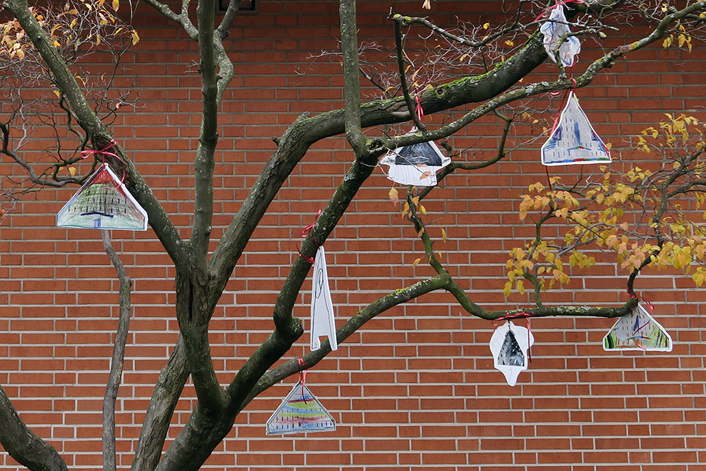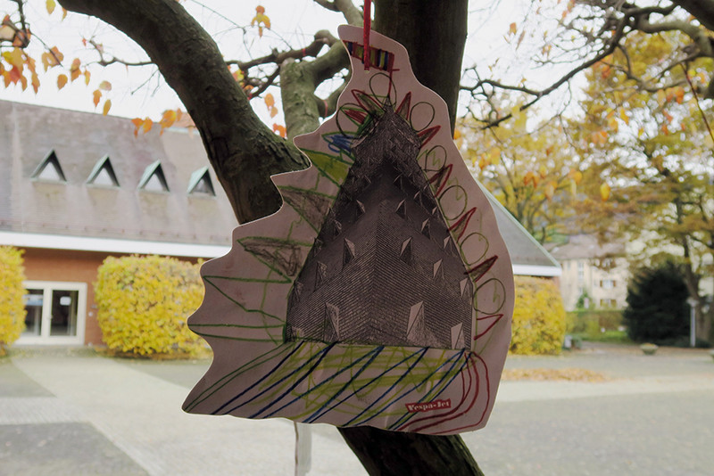 Und weil grad die Adventszeit vor der Tür steht, bringen die Kinder ihre Kirchenvisionen als Geschenke mit zu ihrem Besuch bei der Pfarrerin. Auf wetterfeste Kunststoffplatten gedruckt verzieren sie nun bis Weihnachten die beiden Bäumchen vor dem Eingang zum Kirchgemeindesaal. Ganz in der Tradition von Weihnachtsbaumschmuck.