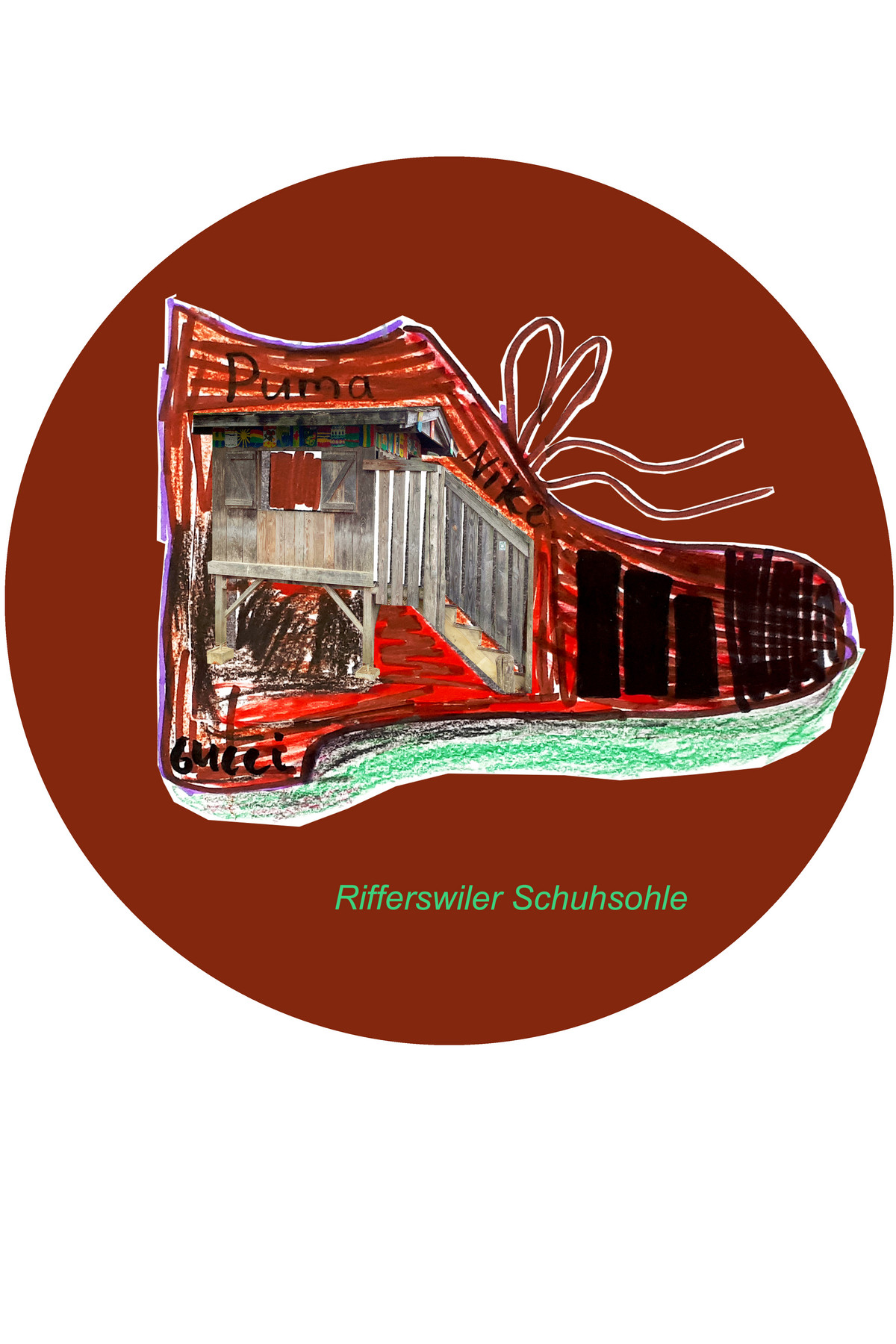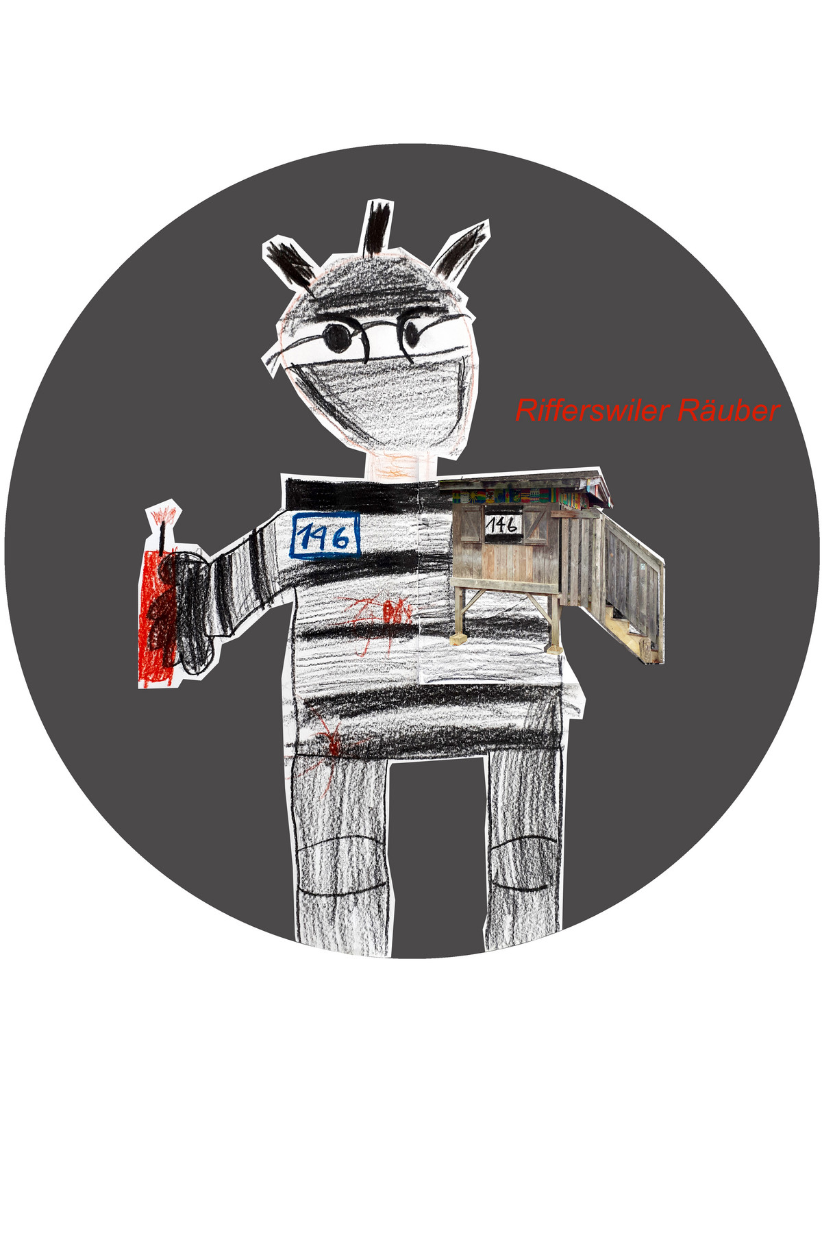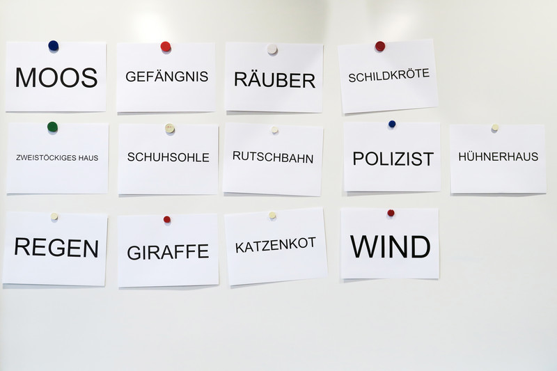 Alle offenen Fragen zum Spielhäuschen werden von der Klasse während des Workshop-Vormittags gemeinsam analysiert und anschliessend mit Zeichnungen, Collagen und einfachen Versuchen beantwortet. Das Resultat daraus: 20 farbig bedruckte, magnetische Rondellen – für jedes Kind der Klasse eine – mit Bildern des Spielhäuschens in unterschiedlichsten Situationen, mit überraschenden Formen und Figuren: Regen, Gefängnis, Räuber, Schildkröte, Rutschbahn, Schuhsohle, Hühnerhaus, …