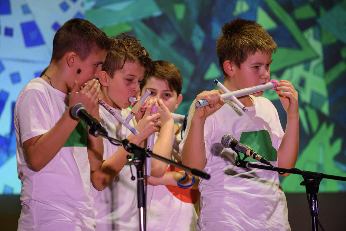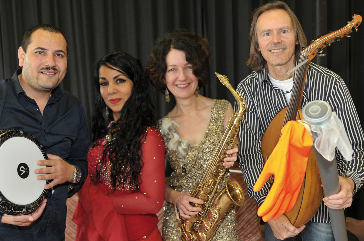 Vier Künstler/innen der Gruppe aus dem Irak, aus Nordmazedonien und aus der Schweiz bieten in Schulen das interkulturelle Musikprogramm «Schnabelwetzer – 7 Lieder in 7 Sprachen» an zum Mitmachen. Singend, klatschend und tanzend lernen die Kinder mitreissende Songs ihrer Mitschüler/innen aus Serbien, Albanien, Spanien, Türkei, Portugal kennen sowie ein arabisches Lied und einen Mundartsong. Mit 20 Instrumenten wie Trompete, Zurna, Bouzoukie, Oud, Flamencogitarre und Darabuka entführt SSASSA auf eine unvergessliche musikalisch- interkulturelle Erlebnisreise. Wie in früheren Programmen beziehen Ssassa die Schülerinnen und Schüler aktiv ins Programm ein, so dass sie fremde Sprachen und Klänge positiv erleben. Für Kinder mit Migrationshintergrund ist der Moment, wenn die weit gereiste, irakische Tänzerin Assala Ibrahim Kinder zum Tanzen einlädt, ganz besonders glücklich, zumal einige Kinder Ssassa mit Darabukas begleiten.