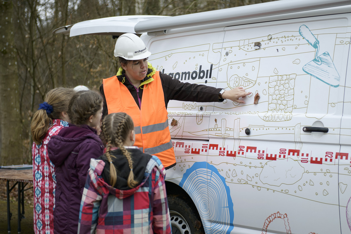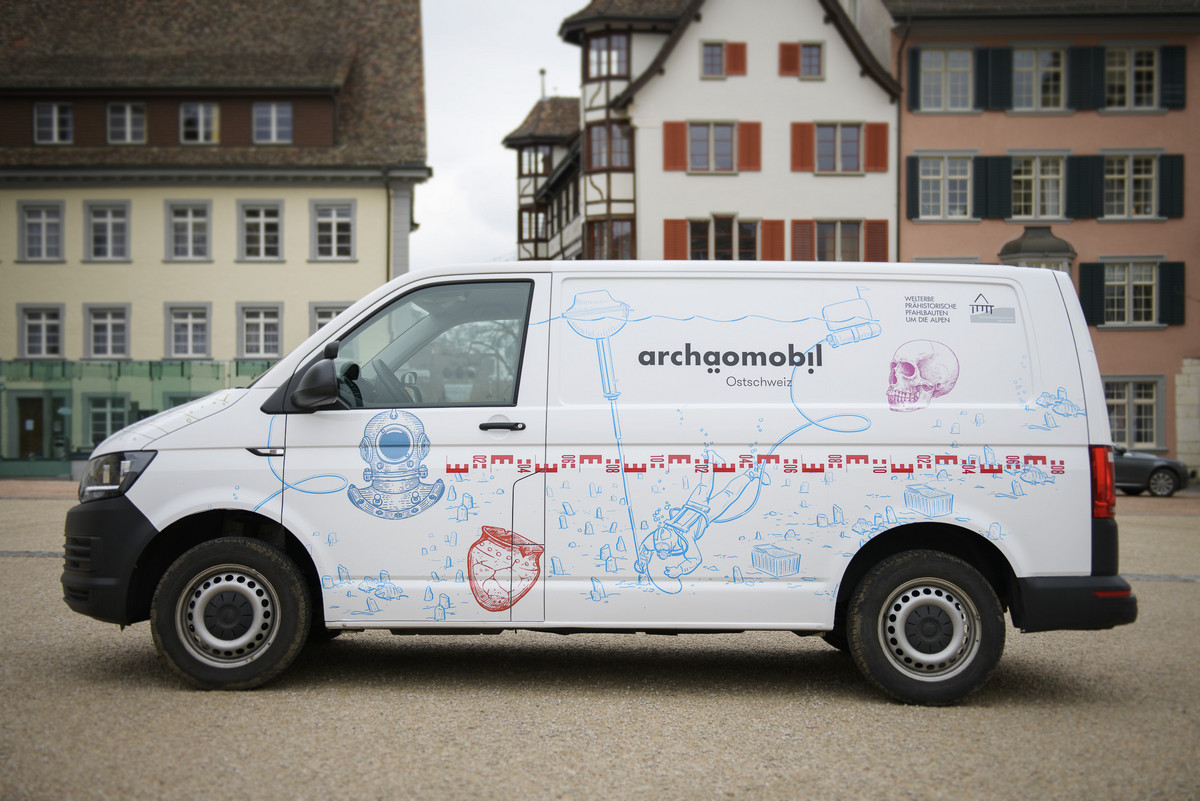 Voll beladen mit archäologischen Originalfunden aus der Region und Anschauungsmaterial rund um die archäologische Forschung fährt das Archäomobil Ostschweiz auf den Schulhof. Von der Schaufel bis zum Vermessungsgerät findet alles im Bus Platz, was Archäolog/innen bei ihrer täglichen Arbeit brauchen.