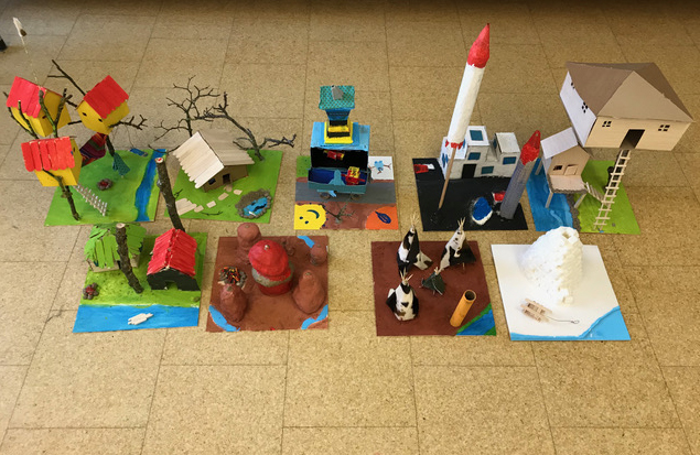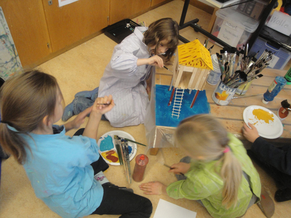 Anhand von Abbildungen sammeln wir gemeinsam verschiedene Haustypen. Wir entdecken Ähnlichkeiten und Unterschiede zwischen den Behausungen von Menschen und Tieren. Was beeinflusst die Form, den Ort und die Materialien eines Hauses? Wie haben sich die Bedürfnisse im Laufe der Zeit verändert, von der Höhle in der Steinzeit über das Nomadenleben in Zelten bis zum Bau von Hochhäusern? In einem temporeichen Spiel auf dem Pausenplatz wird bisher Erfahrenes zeichnerisch dargestellt. Anschliessend lernen wir verschiedene Materialien kennen und experimentieren mit ihnen. Alle Kinder werden nun selber zu Planer/innen und Baumeister/innen. Sie werkeln, sägen und nähen. Aus ihrer Fantasie entstehen die unterschiedlichsten Haustypen, die sie zum Abschluss im Klassenkreis vorstellen.