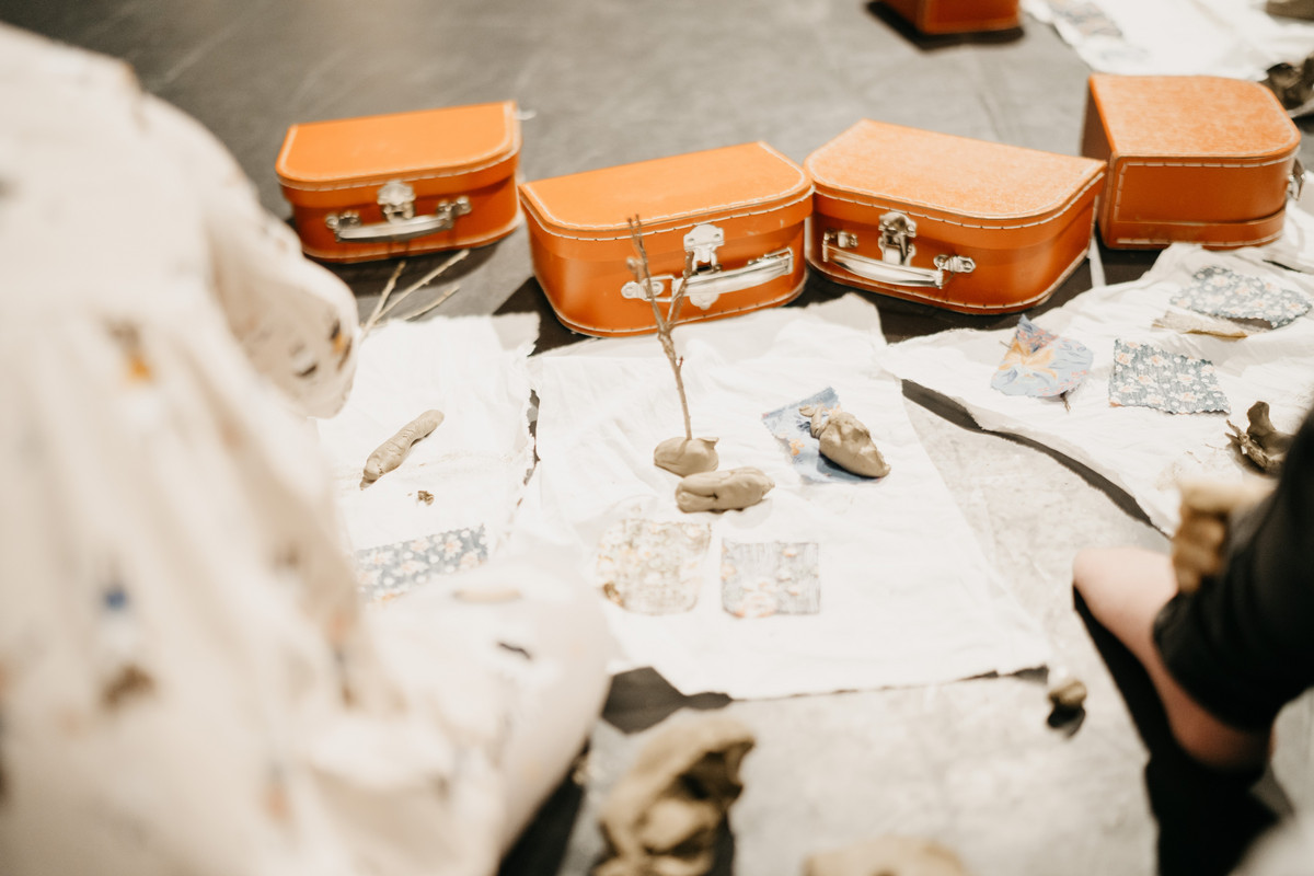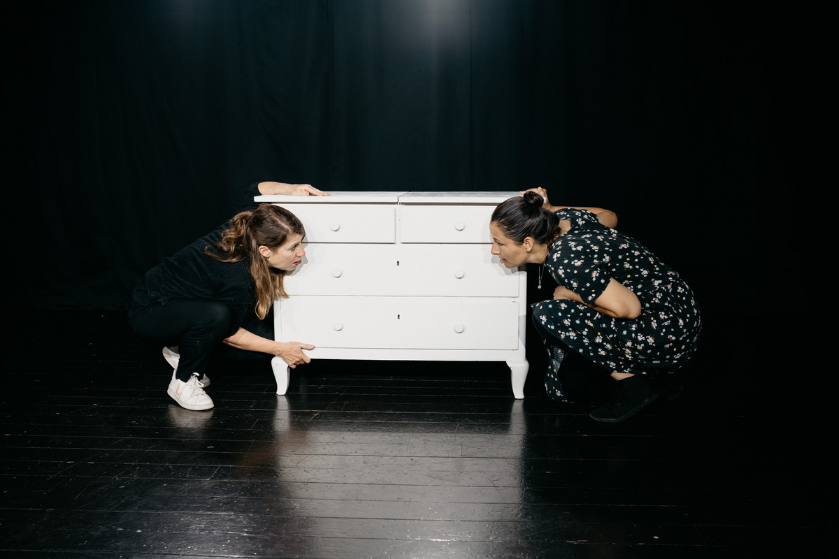 Im Kreis steht eine weisse Kommode. Lotta schläft in einer Schublade. Sie träumt etwas Schreckliches, erwacht mit schlechter Laune und beschliesst von zuhause auszuziehen. Wir verwandeln das Möbelstück in ein Kinderzimmer oder eine Scheune voller Krimskrams, aus einer Schublade springt plötzlich ein bellender Hund, in der anderen ist winziges Puppengeschirr verstaut. Die Kinder spielen und bauen mit und schlüpfen selbst in die Rolle der kleinen Lotta, die wütend durch den Garten stampft.