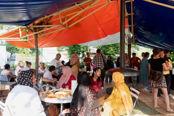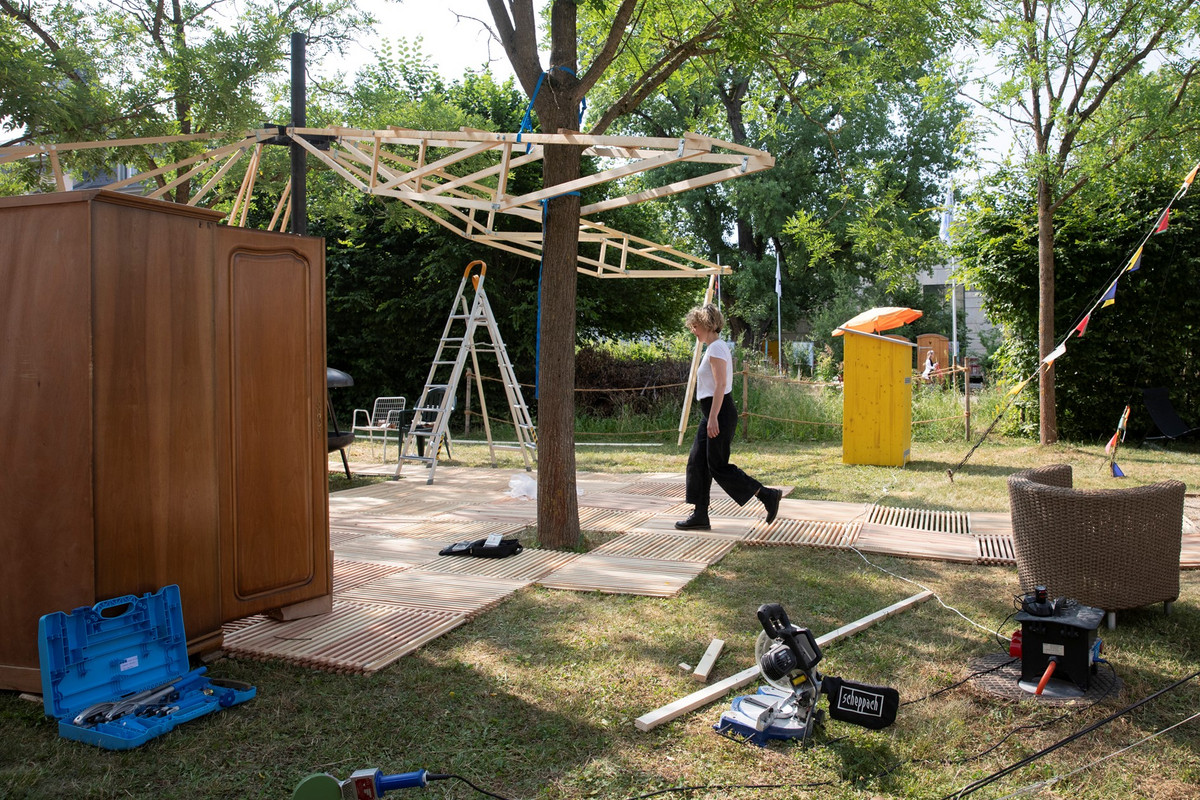 Für die Dauer des Festivals steht er allen offen: Besucher/innen, Anwohner/innen und allen, die gerne Banden bilden. Ob darin gerätselt, getanzt, gegessen oder gespielt wird, das entscheiden die Schüler/innen, die eigene Formate für diesen Begegnungsort entwickeln.