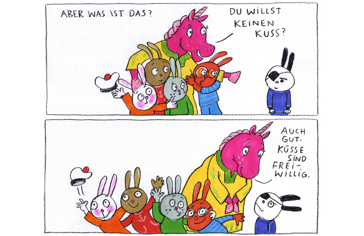 Heute dürfen die Rappelhasenkinder bei Eini übernachten. Hurra! Ohren gewaschen. Zähne geputzt. Wasser getrunken. Pipi gemacht. Pyjama angezogen. Und dann gibt es ... für alle einen Kuss. Aber was das? Du willst keinen Kuss? Auch gut. Küsse sind freiwillig.