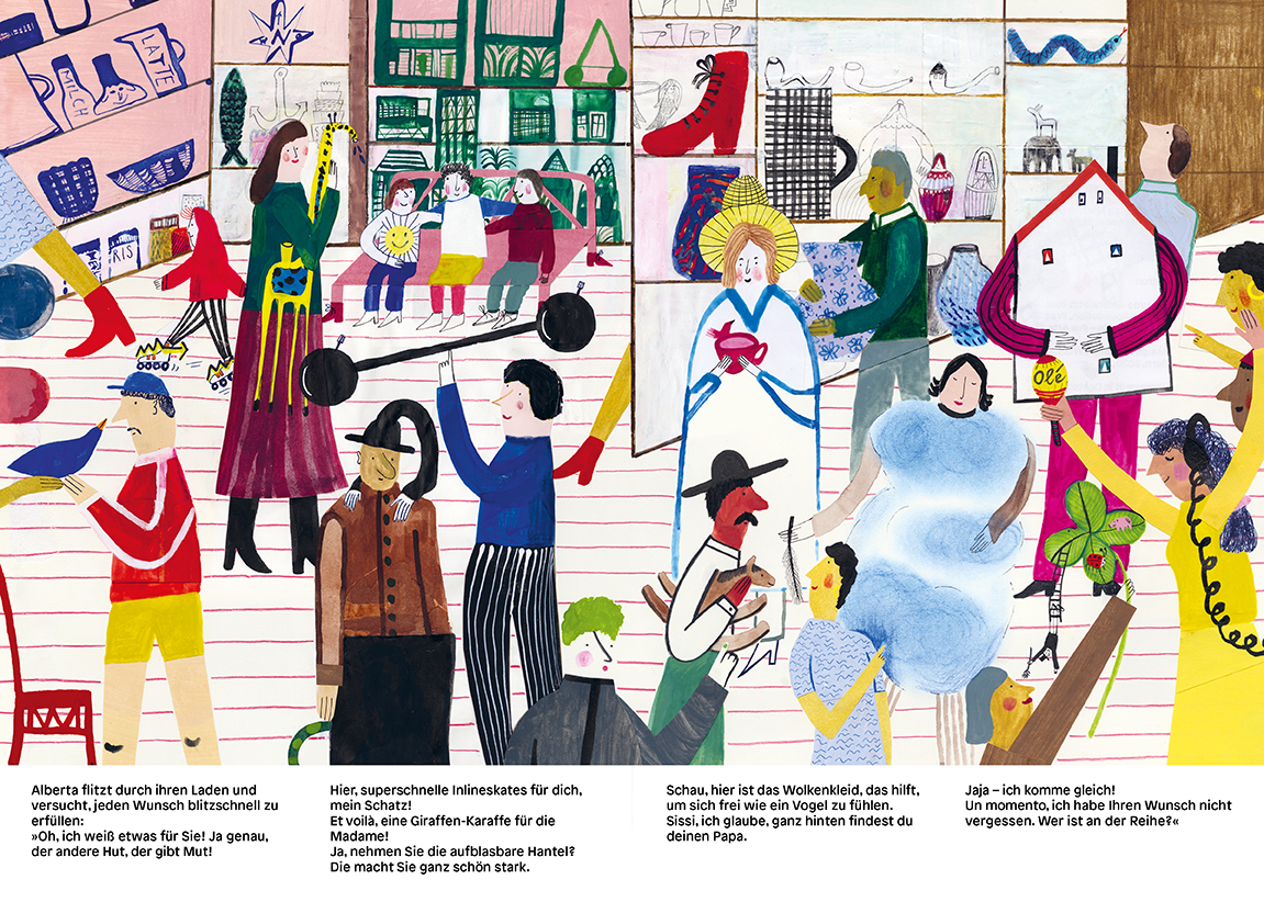 Martina Walther, geboren 1983, arbeitet als selbstständige Illustratorin und Gestalterin mitten in Luzern und im Emmental. «Albertas Wunschladen» ist ihr drittes Kinderbuch und das erste mit Text aus eigener Feder. Ihre Illustrationen entstehen aus einer Kombination von Zeichnung und Collage mit vielfältigen Utensilien, wie Buntstift, Fineliner, Kreide, Tusche, Papierschnipsel, Folien, Pailletten … Eine ebenso bunte Mischung wie das Sammelsurium in Albertas Laden!