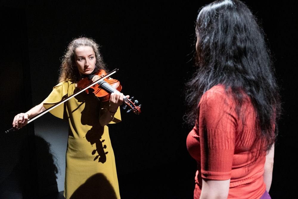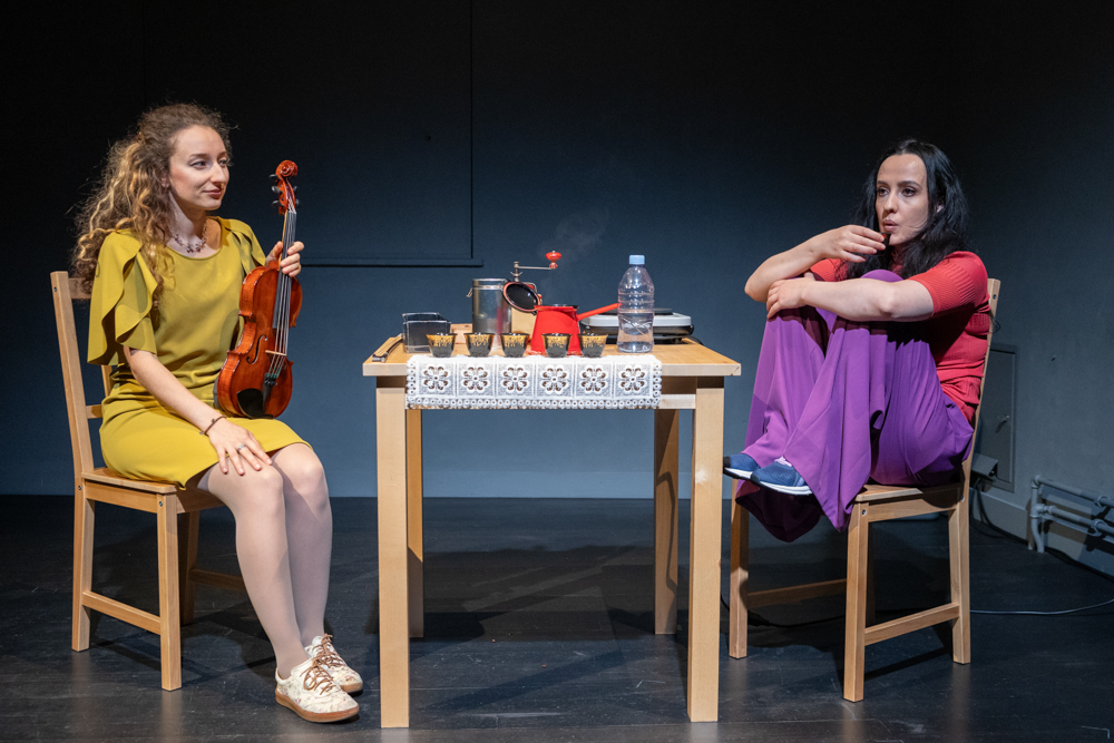 Zwei geflüchtete Frauen begegnen sich in der Schweiz. Die eine kommt aus Syrien, die andere aus der Ukraine. Beide kamen als Asylsuchende, doch ihre Startbedingungen könnten nicht unterschiedlicher sein. Bei einem Kaffee treffen die Frauen unfreiwillig aufeinander, reden und singen gegen- und miteinander, bis sich ihre Sprachen und Klänge zu einem überraschend neuen Sound verbinden.