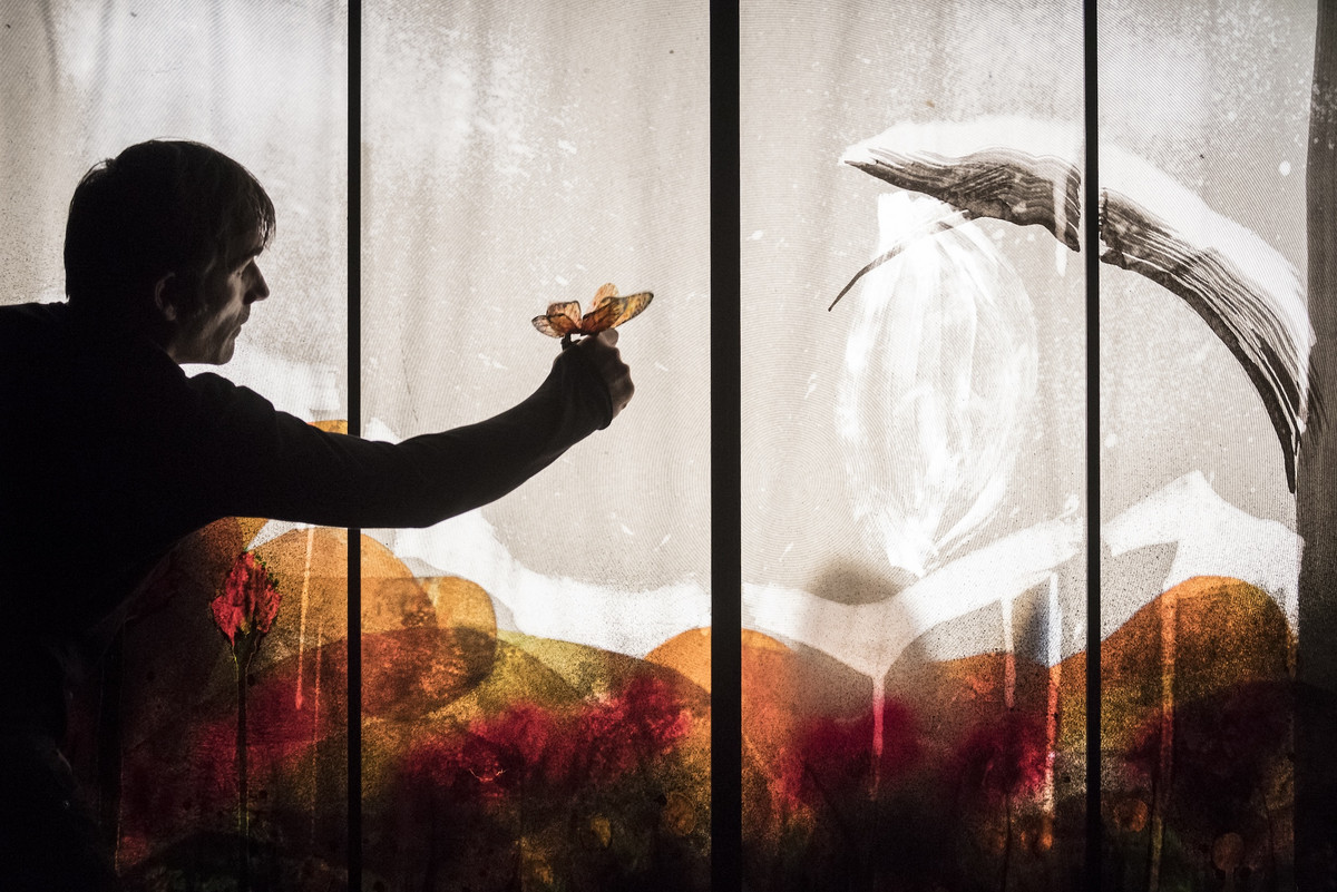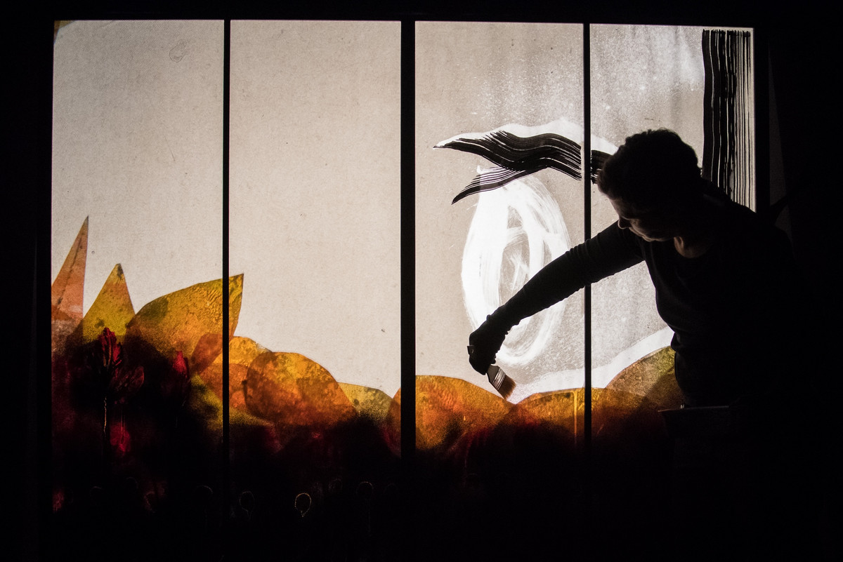 Die beiden Spieler/innen zeichnen und spielen im Rhythmus der Jahreszeiten. Begleitet werden sie von Klängen, die mit Vivaldis Vier Jahreszeiten in Beziehung treten. Papier wird mit Zeichnungen, Projektionen, Figuren und Schattenspiel beleuchtet, gefärbt, zerknittert und manchmal auch zerrissen. Wie ein Kokon wird es zum zerbrechlichen Raum für die Verwandlung der Jahreszeiten.