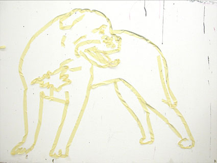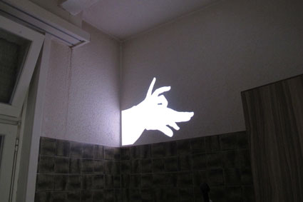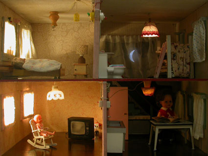 Aufgereihte Spielzeugtiere marschieren über einen Trickfilm-Aufnahmetisch. An der Wand, über einem Hellraumprojektor lauert ein gemalter, überdimensionierter Plastik-Indianer in der klassischen Haltung. Am Fenster steht auf zerbrochenen Scherben «das Glück kommt über Nacht» und über dem Sofa hängt ein Zopf, geflochten aus WC-Papier.